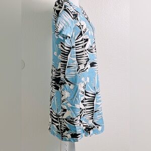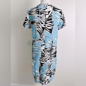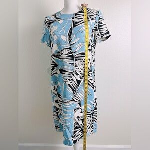 Stylish tropical print dress. Features a vibrant blue and black pattern. Perfect for casual outings. Excellent condition. No flaws. 2 side pockets, back zip closure. Fully lined. Please see photos for details and measurements.