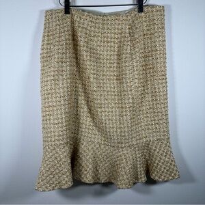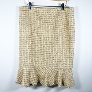 Features: ruffle hem - old money classic style skirt -neutral cream tan with woven gold