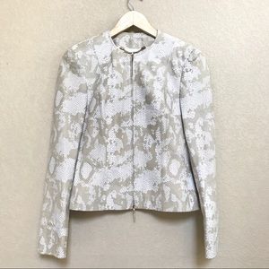 Chic ESCADA lambskin Napa leather jacket embossed with a variegated snakeskin design. Collarless styling with a front zip closure. Impeccably tailored and in perfect condition. Size 34 (equivalent to a size 2/4).