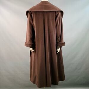 Vintage ESCADA by MARGARETHA LEY coat in a brown cashmere fabric featuring a large shawl collar, long sleeves, and open front. Made in Germany.
