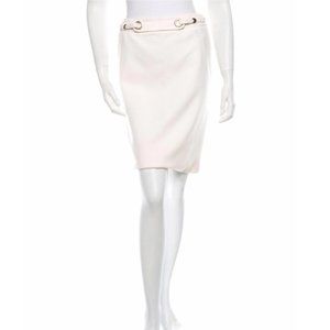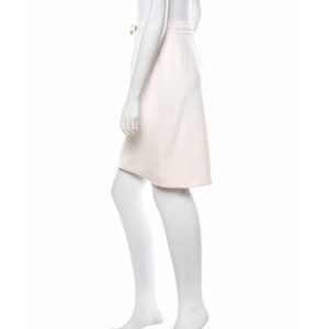 Vintage Creme Escada virgin wool skirt with gold-tone accents, belted waist and side zip closure.