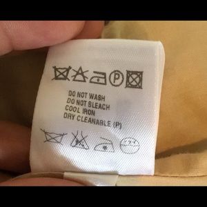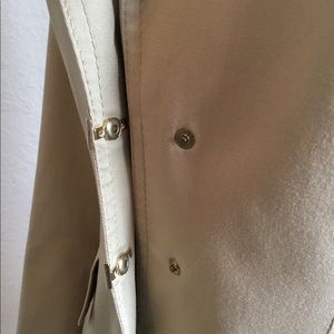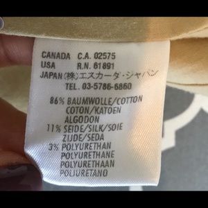 Cream/beige color blazer, dual slit pockets at hips and gold buttons closures at front and pockets. S tiny stain on left sleeve (see picture #4) 86% cotton, 11% silk and 3% polyurethane.