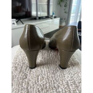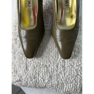 Escada Vintage women's slip-on block-heel pointed square-toe pumps in green leather in Size 8B. Slight wear on soles and heels