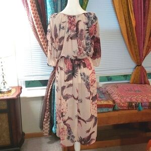 this dress is sheer, recommend a slip, not included. it has tie shoulders, wide arm holes, and an elastic waist which looks great with a belt over it. it's higher in the front and lower in the back. it's a cream dress with white polka dots and burgundy flowers.