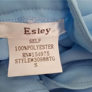 ESLEY BLUE RUFFLE BLOUSE SZ.S GUC. GORGEOUS BLOUSE IS GOOD USED CONDITION. SPOT ON SLEEVE AS SHOWN IN PIC #4.