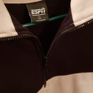 White and Black striped pullover sweatshirt with a quarter neck zipper. Is very comfortable and warm.