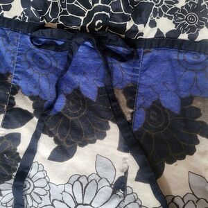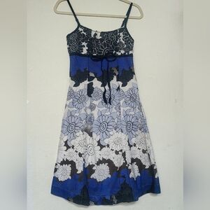 Chic dress with spaghetti straps and a floral design. Features black and blue colors.