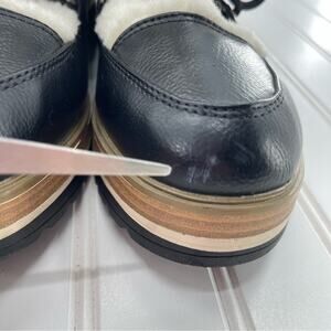 Trendy and stylish faux fur boots, featuring a thick lug sole, slip on style with wrap around lace tie. Excellent, like new condition with a small scuff on front. Which may easily be buffed or corrected, I have not tried.