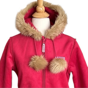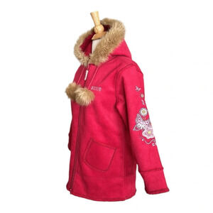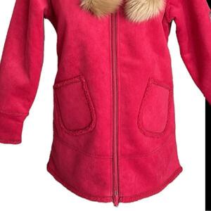 Whimsical adorable faux shearling magenta pink coat by Esprit. She features a faux fur lined hood, interior Sherpa lining and trim details, hand pockets, zip front, and an embroidered left sleeve design. It also has a reflective heart trinket that can be attached to the zipper.