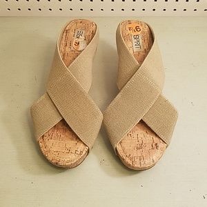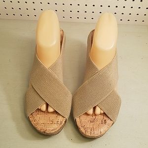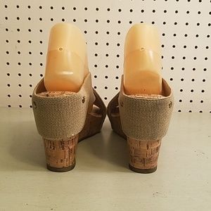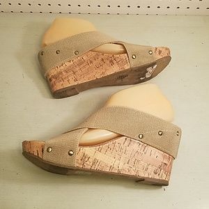 BEAUTIFUL TAN WEDGE SANDALS WITH STUDS AROUND THEM WORE ONCE