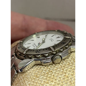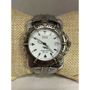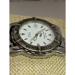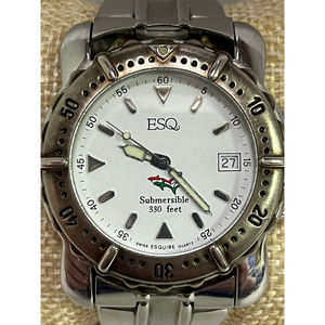 ESQ Submersible watch Swiss Quartz Esquire. Preowned as-is. Tested. Needs a new battery. Some rub wear and scratches on case and band. Metal band comes apart may need servicing or future replacement. No refunds. No returns.