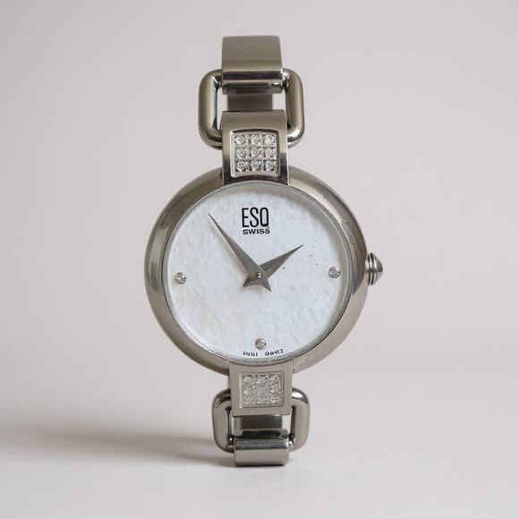 ESQ by Movado E5407 Diamonds Stainless Steel White MOP Dial Bangle Bracelet Women's Watch. Very good preowned condition, worn a handful of times, one owner. Dial and band are in very good shape, no wear