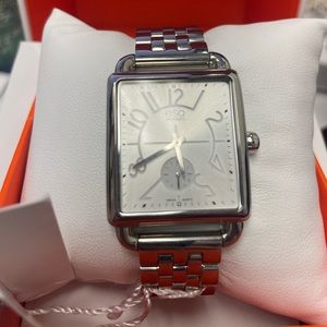 Rectangular silver-tone case with U-shaped lugs and e logo crown