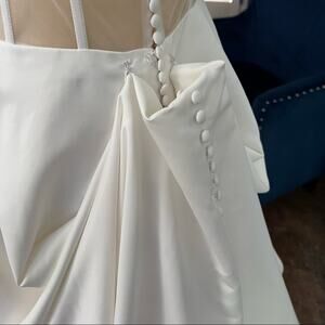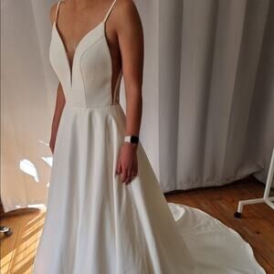 ESSENSE OF AUSTRALIA CLEAN DOVE SATIN BALLGOWN WITH SHEER BACK SIZE 12. This simple and utterly chic ballgown from Essense of Australia is the statement of every modern bride’s dreams! A seemingly simple design, there’s more to it than meets the eye when you make your grand entrance. The curved V-neckline and shoestring straps are enough to make any minimalist fall in love, not to mention the hidden skirt pockets to send you completely head over heels. The back detail is the real piece of resistance, as the classic V-back is framed by sheer illusion paneling with exposed boning—making this dress truly fashion-forward and one of its kind.