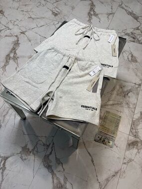 Soft heathered sweat shorts with elastic waistband and drawstring. Subtle ESSENTIALS logo at the hem. Comfortable cut for casual wear. Neutral tone easy to pair.