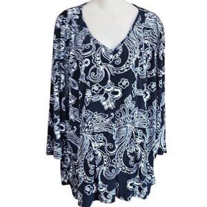 Stylish black and white paisley V-neck top. Perfect for any occasion.