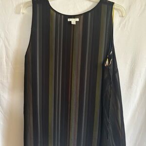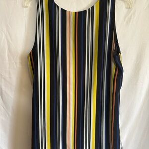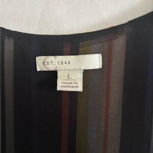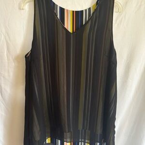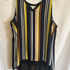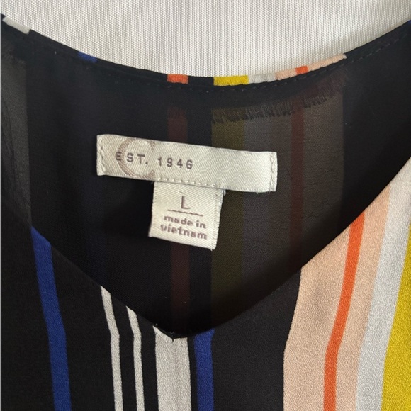 Stylish blouse with vertical stripes in black, blue, orange, and yellow. Perfect for a chic look.