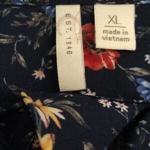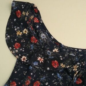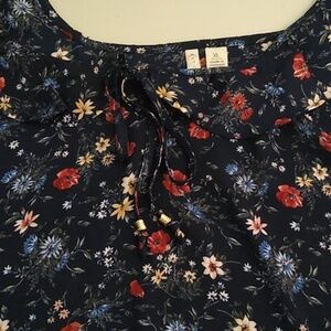 FEMININE FLOWY, FLORAL IN NAVY, BRUGUNDY, DENIM BLUE, WHITE, GREEN. RUFFLE FORMS THE FRONT SHOULDER AND ACROSS THE NECKLINE ENDING IN A TIE FOR A SMALL KEYHOLE, ACCENTED BY GOLD TIE BEAD. DRESS IT UP OR DOWN. LOOKS GREAT WITH DENIM.