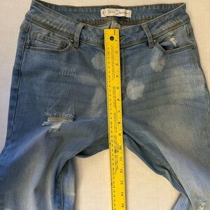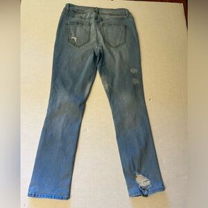 These Distressed medium wash blue jeans offer a sleek fit with a range of blue washes, from light to dark indigo. The denim's natural wear patterns and fading add a unique character, making them a stylish choice for any occasion. Front & back pockets. 98% cotton & 2% spandex. Pre owned in great condition.