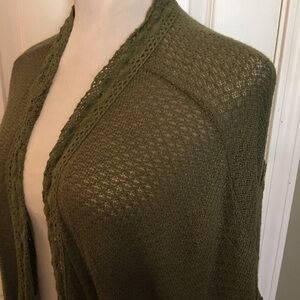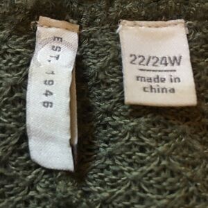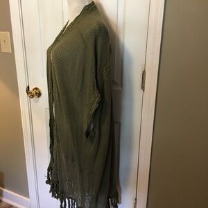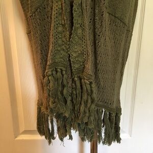 EST 1946 loose knit sleeveless open front cardigan size 22/24. Olive green color. Tasseled hem and crochet detail on the back. Some light wash wear. Boho, country core, lagenlook.