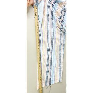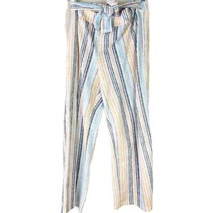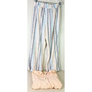 This is a stylish and comfortable set from EST 1948, perfect for springtime. The collared top is made of 100% cotton and features a stylish pattern, while the high rise stripe pants are made of lightweight cotton and have a wide-leg design. The pants are also equipped with a tie waist and pockets for added convenience.