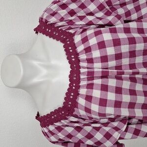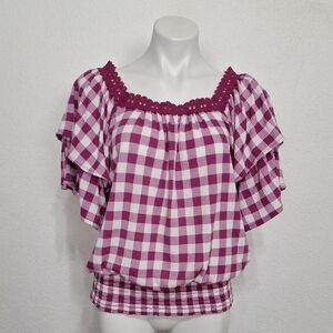 gingham blouse, pink checkered top, flutter sleeve top, crochet trim blouse, boho peasant blouse, smocked hem top, casual spring top, summer casual wear, cottagecore aesthetic, festival blouse
