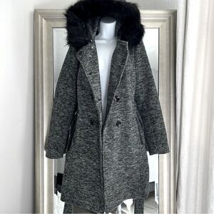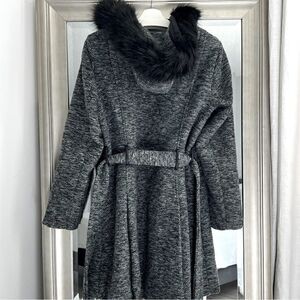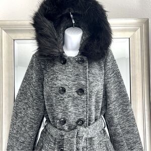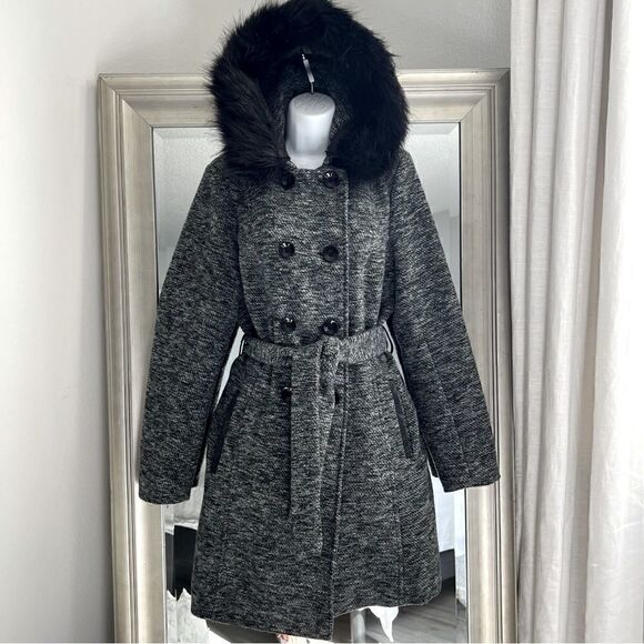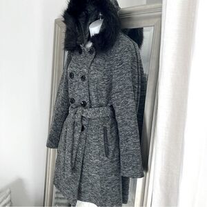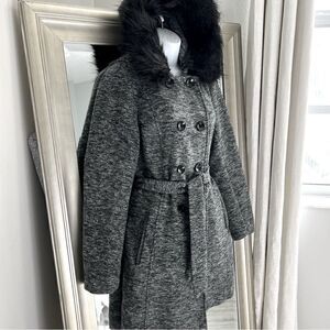 Used excellent condition CB Black & White AcrYlic BELTED Hooded COAT Fur Trim size M Trench W/ Pockets Gr8.