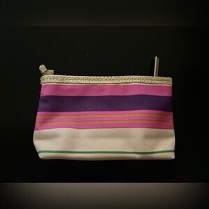ESTEE LAUDER colorful tote with matching wallet. This gorgeous tote is ideal for the spring and summer seasons with its vibrant pink hues and yellow basket weave trim. Featuring a fully lined and roomy interior and a matching zippered wallet with a horizontal stripe pattern. Clean inside and out and in like-new condition.