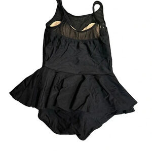 Classic retro-inspired black one-piece swimsuit by Esther Williams featuring a flattering peplum skirt and mesh detailing — timeless, elegant, and confidence-boosting.