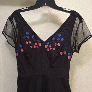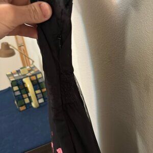 Comes from a smoke free pet friendly home. Side zipper, banded waist in front and smocked waist in back. Material is non stretchy cotton poplin. Has pockets. Dress is not lined. Tulle cap sleeves. V neck in front and back. Length 41, bust 16, waist 12 can stretch 4 more inches at least due to smocking. hip 19. New without tags. No flaws or damage.