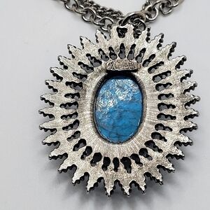 ESilver Medallion Necklace Crown Long Faux Turquoise