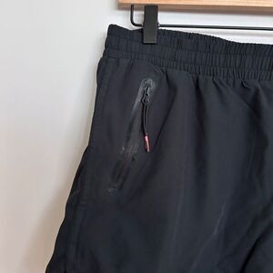 Details: Lightweight athletic shorts from Esprit, neon trim/details, two functional zippered pockets on front, dolphin hem on sides, elastic pull string on inside of the waist to tighten