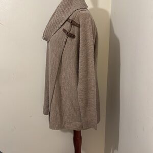 Ellen Tracy taupe cowl neck sweater. It has two leather snaps that holds material to appear to be a wrap around. Extra fine merino wool. Very soft. Cowl neck is cable knit. In excellent condition. Size M