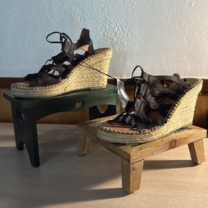 ETC! Black Faux Leather Lace up Cork Wedges Size Large 8-9 are New With Tags but to say Leather laces need to be replaced. So check out these super sexy lace up sandals to kickstart the coming warm weather!! Originally priced at $30 we will kick off $5 so you can replace those laces and have brand new wedge sandals for just $25!!