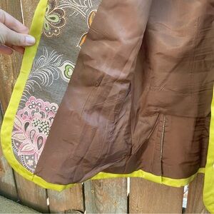 Chic brown blazer with vibrant yellow trim. Features elegant floral patterns. Perfect for stylish occasions.