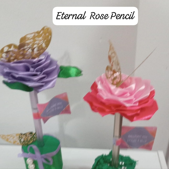 Ribbon Hand made Rose ๐น Pencil โ๏ธ with holder thin Pencil has a diamond ๐ on the top with Eternal Rose do you want to give something different now is the time I can make you the color of you preference each Pencil sell separate