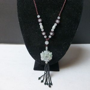 AUTHENTIC GREEN AND WHITE JADE NECKLACE LOVE AND LUCK FLOWER WITH 12 JADE BEADS MACRAMED WITH A FRINGE of BEADS.