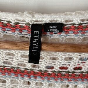 Ethyl open weave crocheted cardigan with fringe hem. Hooded with an open front and stripes. Coral, blue, green, and winter white / cream.