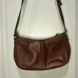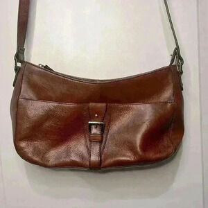 Etienne Aigner leather purse in excellent used condition. Purse has front buckle detail, adjustable strap, open front pocket, middle pocket with zipper closure between two open pockets. Excellent condition with slight discoloration on bottom, which can probably be cleaned.