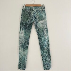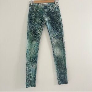 Etienne Marcel Green & Blue Leopard Printed Jeans. A fun and funky print to these low rise skinny jeans. 5 pocket design, button closure with zip fly. Belt loops.