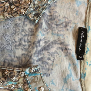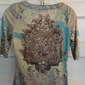 Very unusual Tshirt with ornate V neck and the image of a lion in the front and the back, also animal print details in the sleeves.