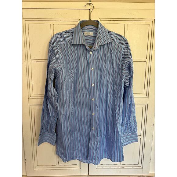 ETON mens shades of blue and white stripe button down shirt in excellent condition. Size 41 which according to their website is a large. 16” neck. contemporary fit. Measures 23 1/2” from armpit to armpit and 31” long.