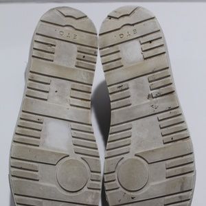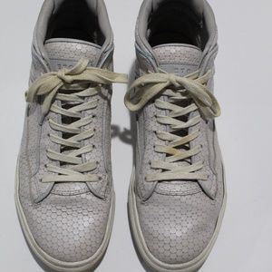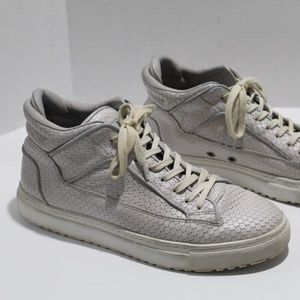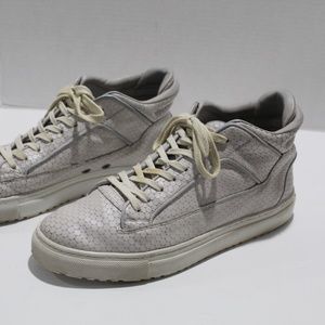 ETQ LEATHER SNAKE LIKE IMPRINT MID to HIGH TOP SNEAKER WHITE GRAY Mens Size 9 HI-END & RARE. Sneakers laces have a rust mark toward bottom as pictured. Leather is over all clean and free from stains, holes and tears. Has signs of wear, a matte white with gray undertone, snake like imprint in leather. High end designer sneaker handmade in Portugal.