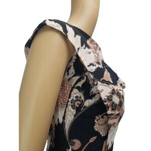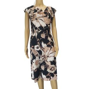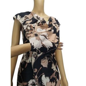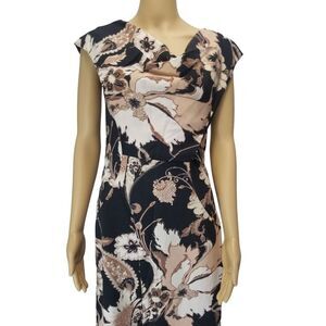 Etro 42 floral & paisley sleeveless sheath midi dress. Floral print draped neck with concealed hand warmer in front center. Bodycon fit. Slight cowl neck. Hidden 17" back zip closure. Back darts. Fitted waist v neck. Italian-wool curve-conscious seams.