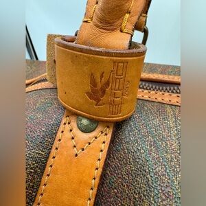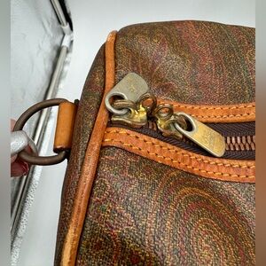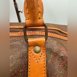 ETRO- Authentic-Paisley Print Bandolier Duffle Bag 55 cm; has D Rings to add shoulder Strap (strap is not included); Includes Poignet but no luggage tag; Piping has some rubbing and exposure, easily repaired at the cobbler; Inside is clean; Leather has some wear and Patina, but in good condition
