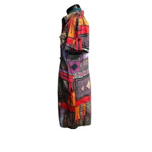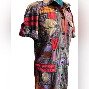 This ETRO Italy women's shirt dress in size 42 features a unique multicolor geometric patchwork design, giving it a Southwestern character. Made from a comfortable cotton blend material, this knee-length shift dress is both lightweight and includes pockets for added convenience. The button closure adds a stylish touch to this versatile dress suitable for travel, casual outings, workwear, and business occasions, all while showcasing the quality craftsmanship of the Italian brand ETRO.