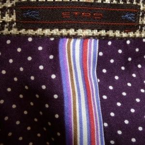 ETRO MILANO blazer/hacking jacket, Silk blend size i50 long, measures at a 40L, please use measurements for accurate fit, brown glen paid ..3 pockets front(flap) , colorful lining,made in Italy ,totally stunning classic!