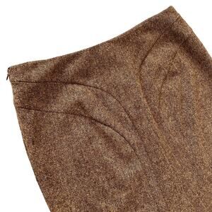 Italian designer Etro wool skirt in a brown tweed with flecks of yellow and Orange size 46, which translates to a size 10 US. Excellent condition with no flaws, hits above the knee with seams that accentuate backside and a vintage style middle double pleat. Side zipper closure with hook and eye, fully lined.