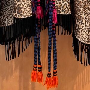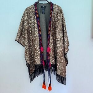brown/beige wool draped design all-over leopard print fringed edge tassel detail jersey jacquard border