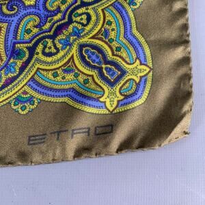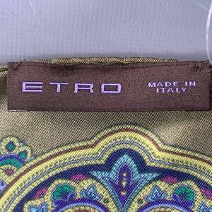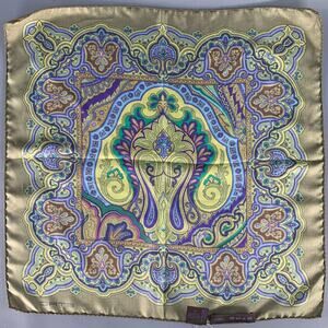 ETRO pocket square in a green silk featuring a multi-color paisley print. Made in Italy.